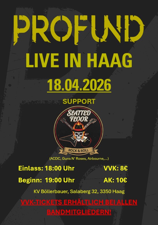Es ist soweit, wir können die ersten musikalischen Schmankerl bekanntgeben. Mit Profund und Slatted Floor haben wir die ersten Bands fixiert die den Nachmittag rocken werden. Am 18.4.2026 könnt ihr euch beim Böllerbauer schon einen kleinen Vorgeschmack holen. Erscheinen Sie, sonst weinen Sie !